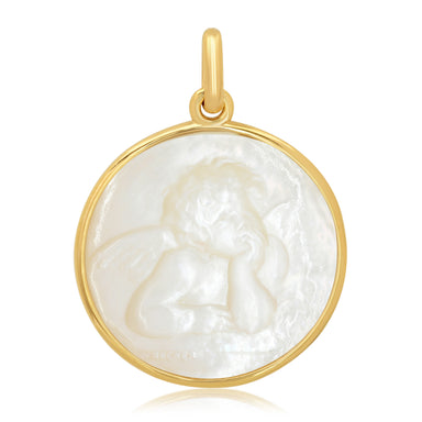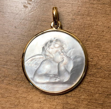 The Ange Raphael with his face in his hands, looking towards the sky. Wonderful 18K yellow gold surround this finely crafted Mother of Pearl medal...
