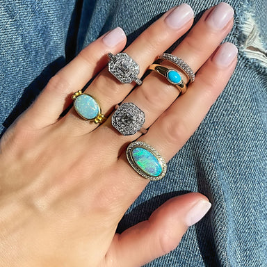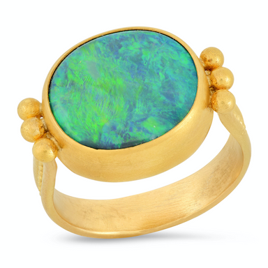 Glam and glitz are just a click away with this Etruscan Blue Opal Yellow Gold Ring. Glam up any look with this opal gold ring. Simply beautiful, th...